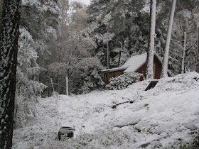 Snön faller ner och lägger sig som ett vitt täcke över mark, träd och buskar. Barnen tycker att det är spännande, men i ärlighetens namn... är inte 22a Oktober lite väl tidigt för detta? Kom igen om en och en halv månad. Nu vill vi ju njuta av hösten och alla de vackra färgerna som den omges av. Inte ett vitt landskap, inte just nu, även om det är precis det vi kommer att önska oss i december.